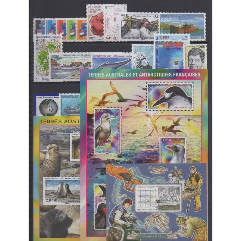 Azur Philatélie vous propose les timbres des Terres Australes et Antarctiques Françaises de l'année 2008 (No 494/520, BF 19/BF21).